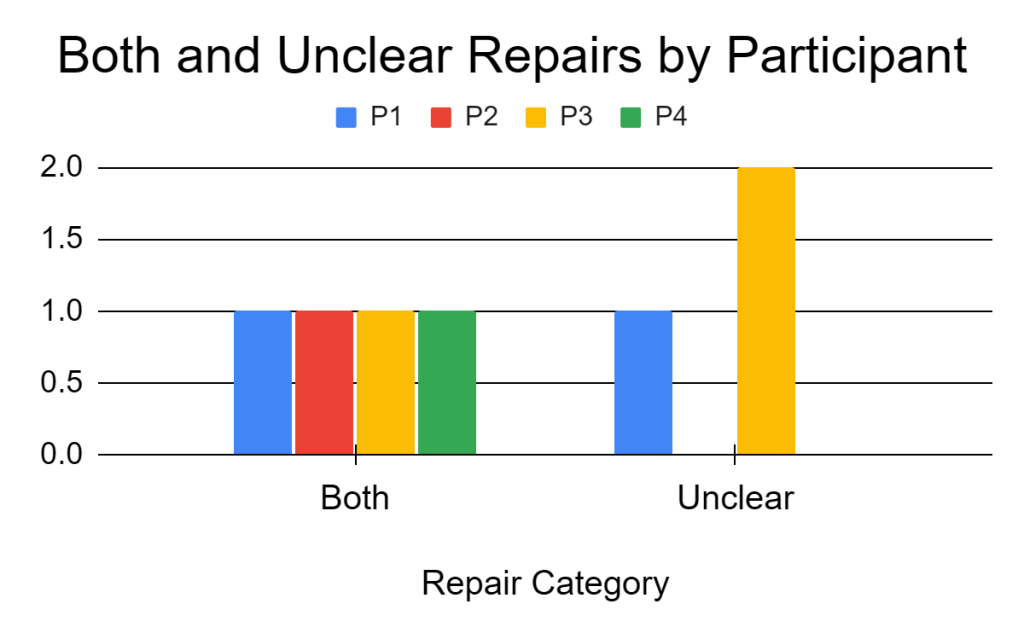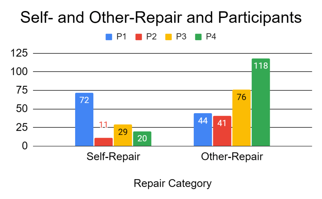 As can be seen in Figure 1, other-repair was the largest category with 279 repairs. Of the other-repair category, Participant 4 had the highest amount, and of the self-repair category, Participant 1 had the highest amount. Participant 2, who spoke the least out of every participant, also had the least amount of each category (besides the Both category where every participant had an instance of such and the unclear category where Participant 4 also had none).